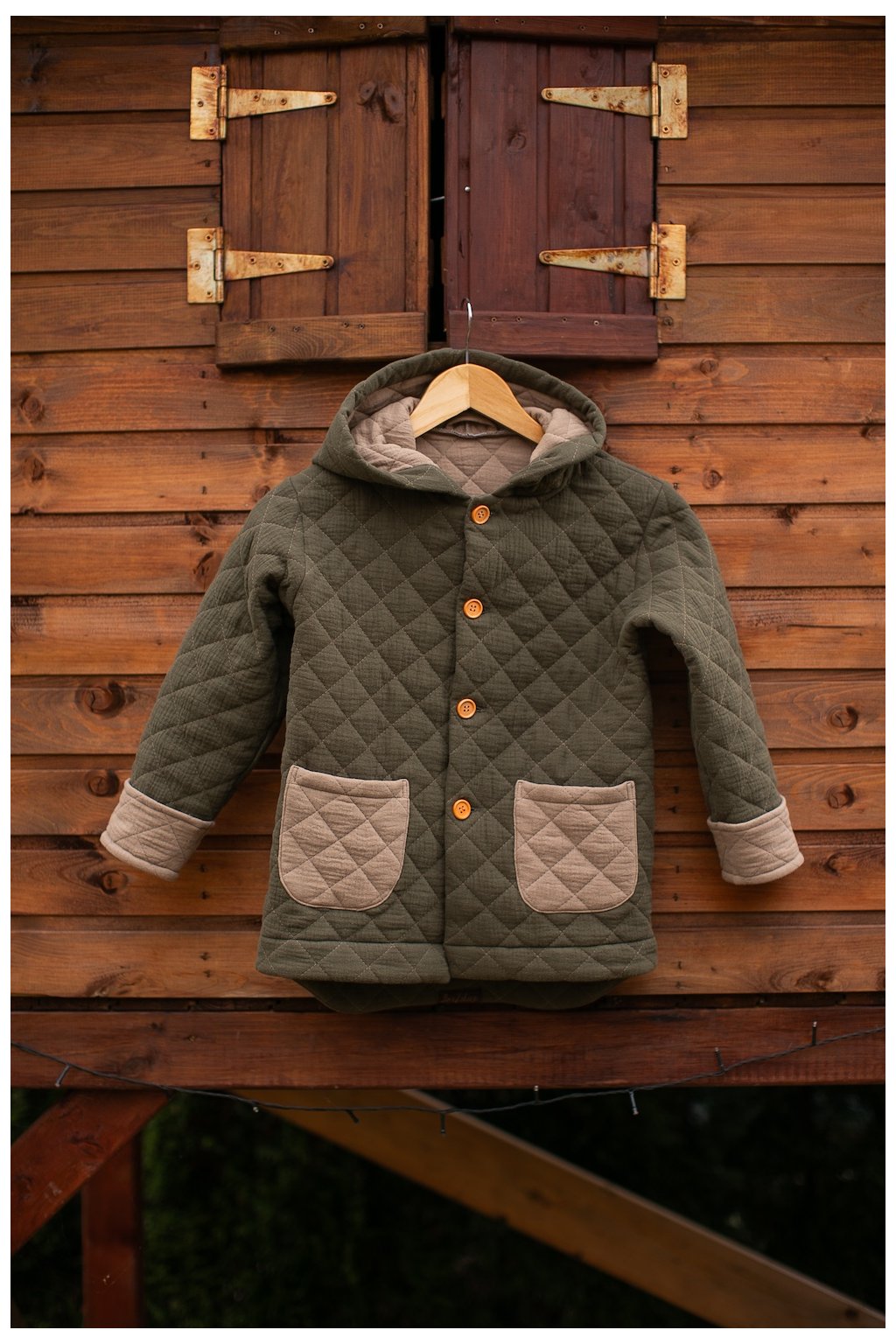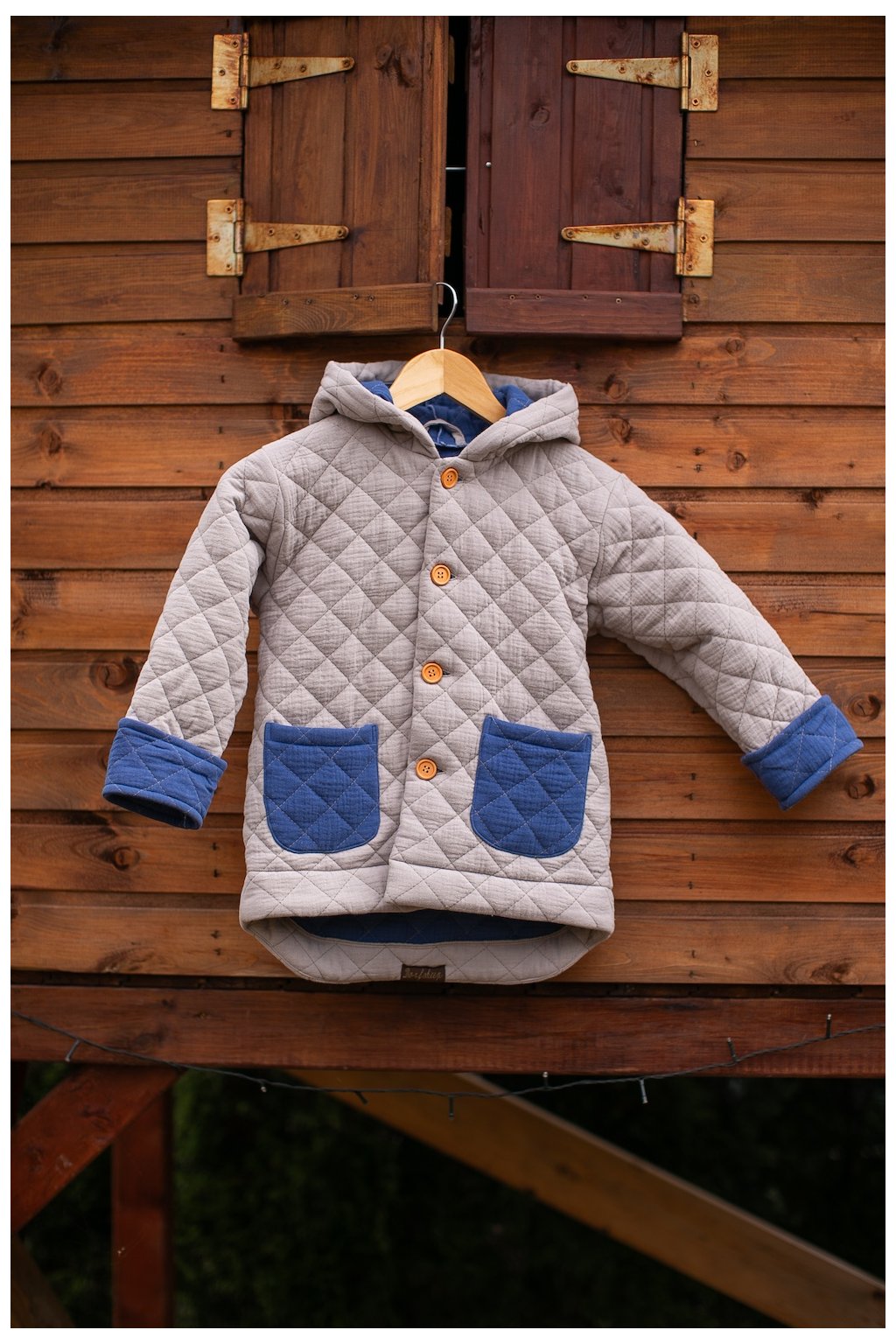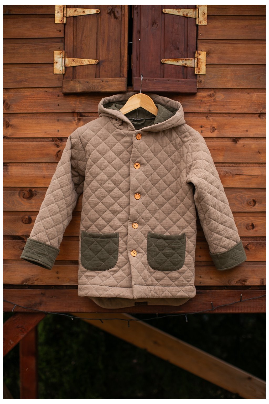 Hrejivá zateplená bunda z prešívaného mušelínu s kapucňou a vreckami. Bunda je vhodná na chladné jarné a jesenné dni alebo teplú mestskú zimu.