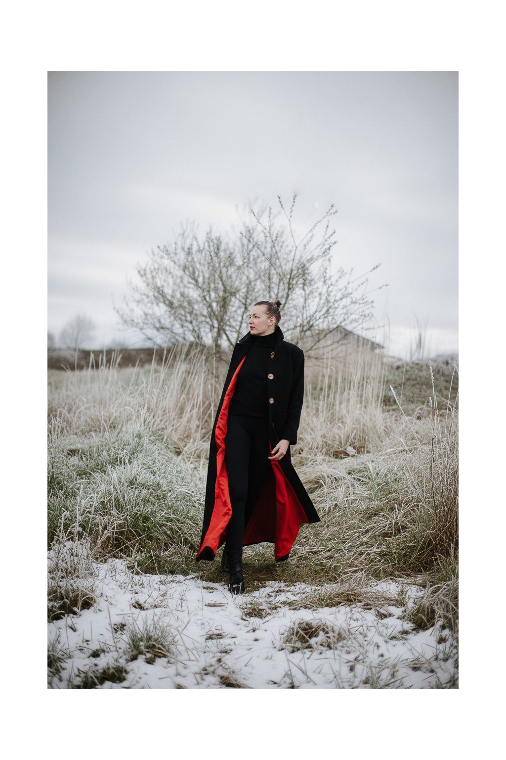 Prebuďte v sebe hrdinku z románu! Tento exkluzívny vlnený kabát s prímesou kašmíru sa postará o to, aby ste sa v dave stali neprehliadnuteľnou a sama ste sa cítila ako princezná. Dĺžka kabáta opticky predĺži každú postavu a dodá jej nežnú ženskú siluetu. Červená podšívka kabáta dodá rafinovanosť a zmyselnosť.